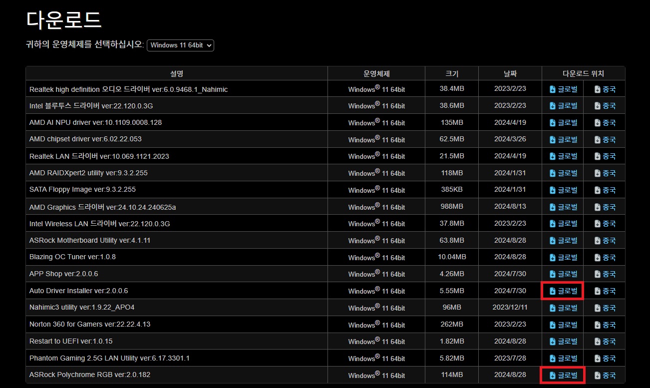 1) 어항 PC 메인보드 전용 다운로드 링크 클릭 2) 두가지 프로그램 (빨간색 네모 표시) 글로벌 버젼 다운로드 및 설치